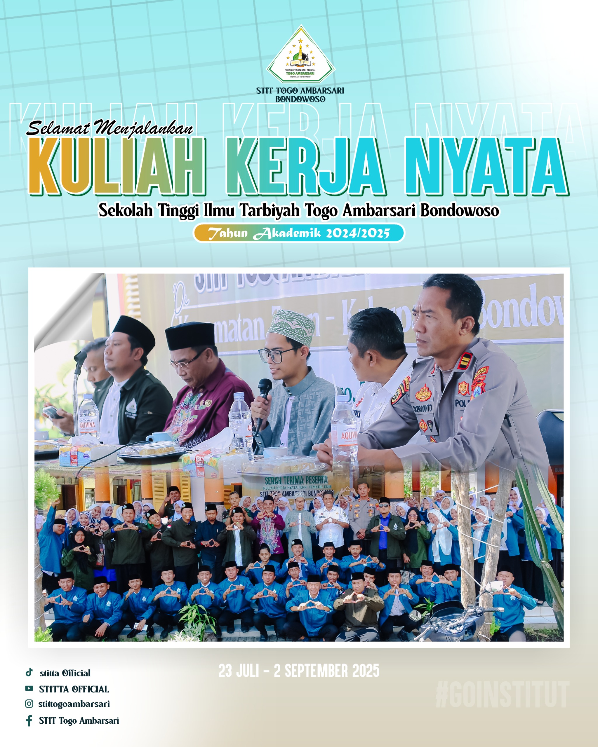 Tapen, 23 Juli 2025 – Sekolah Tinggi Ilmu Tarbiyah (STIT) Togo Ambarsari resmi melepas 54 peserta Kuliah Kerja Nyata (KKN) Tematik berbasis Pengabdian kepada Masyarakat (PkM) di Kecamatan Tapen. Acara serah terima berlangsung di Kantor Kecamatan Tapen, dihadiri oleh sejumlah pejabat, tokoh agama, serta sivitas akademika kampus. Kegiatan KKN ini akan berlangsung selama 40 hari dengan sejumlah program unggulan berbasis pemberdayaan masyarakat.